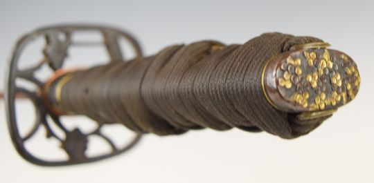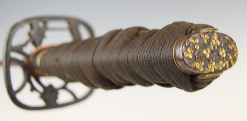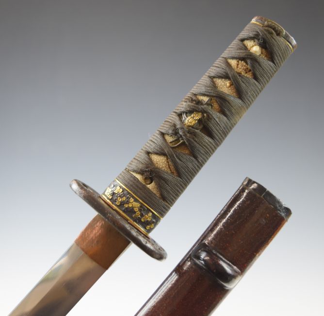 Japanese Meiji period Wakizashi Samurai sword with pierced tsuba, embossed and gilt kashira, menuki and fuchi, bound shagreen handle and 41cm blade, in scabbard. PLEASE NOTE ALL BLADED ITEMS ARE SUBJECT TO OVER 18 CHECK ON COLLECTION OR DELIVERY