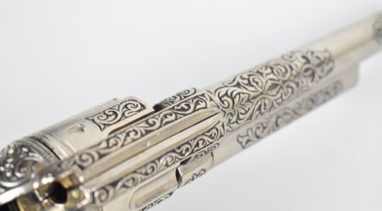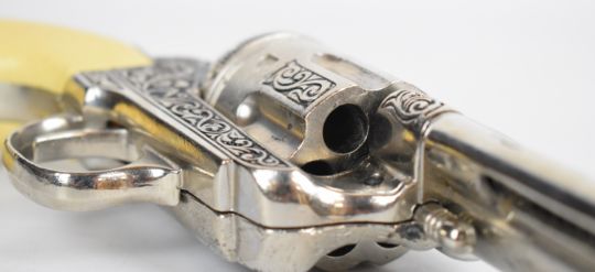 A near pair of Colt style six shot single action revolvers, each with ornate decoration to the frame, chequered faux ivory grips and 4.75 and 7 inch barrels.