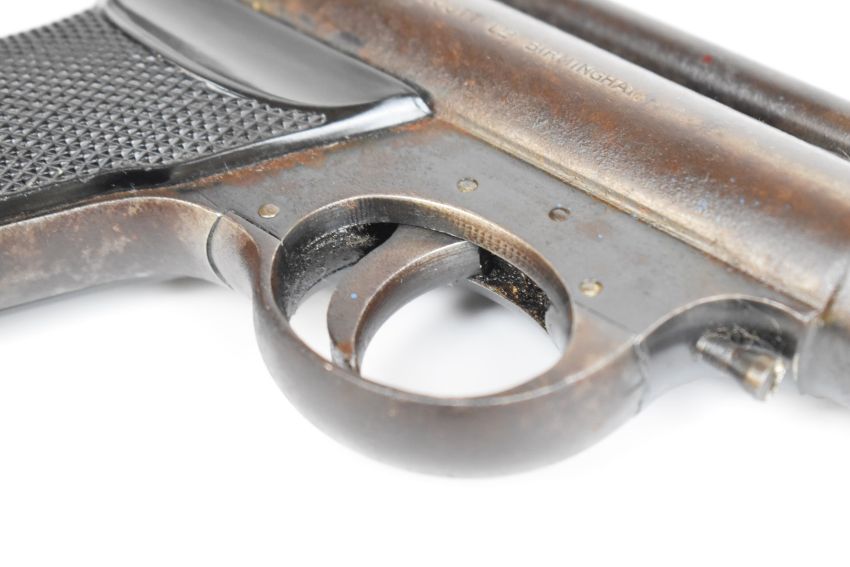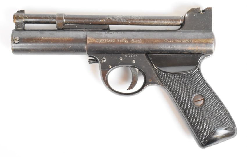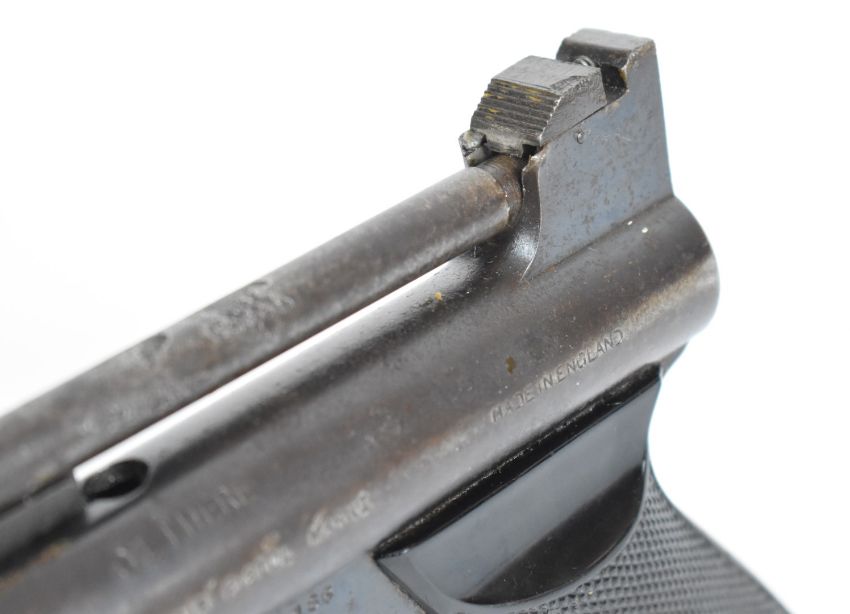 Webley Mark I .177 air pistol with chequered grips and adjustable sights and trigger, serial number 50186.