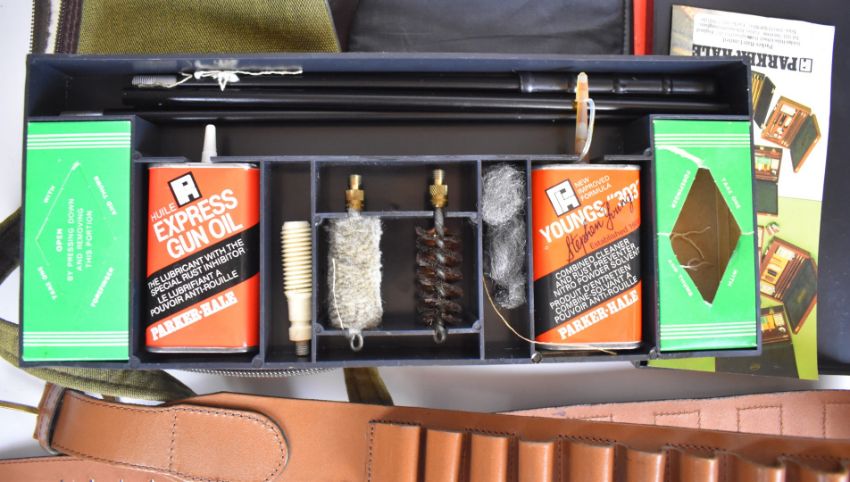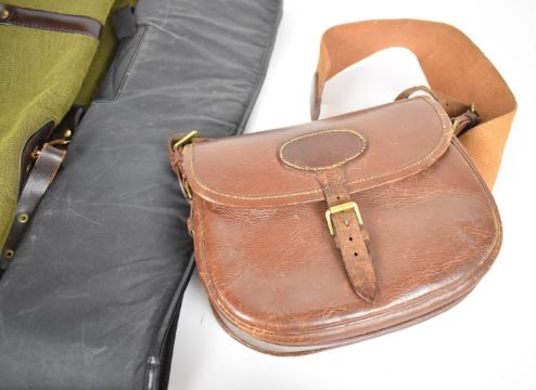 A collection of shotgun or rifle accessories comprising two gun slips, leather cartridge bag, cartridge belt and Parker-Hale cleaning kit.