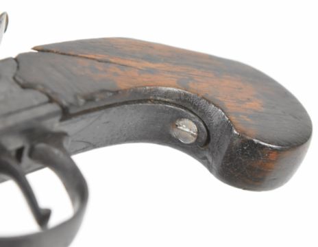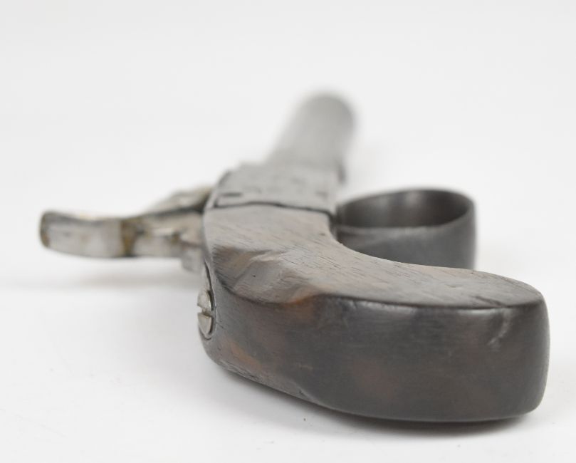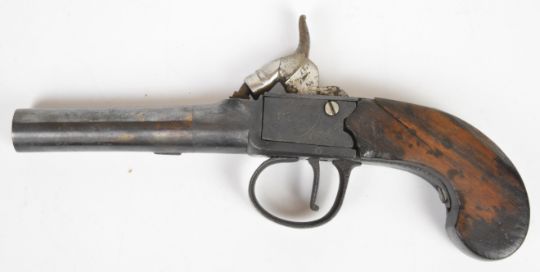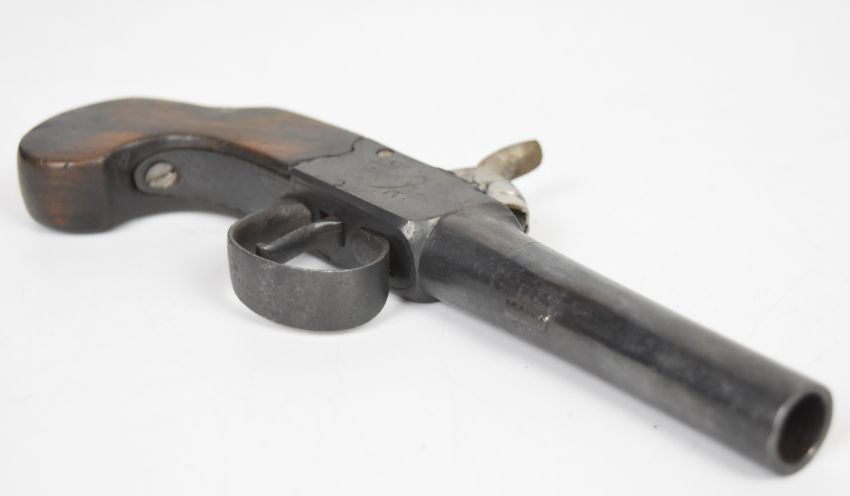 Lacy of London percussion hammer action pocket pistol with named and engraved lock, wooden grip and 2.5 inch smooth bored turn off barrel, overall length 17.5cm.