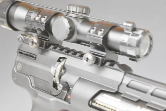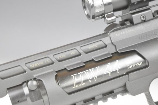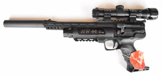 Weihrauch HW44 .177 PCP air pistol with shaped grips and adjustable sights. scope rail, sound moderator, 10-shot magazine and Weihrauch 2x20 scope, serial number 707032, with original tag and moderator tube.