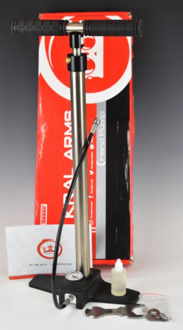 Kral Arms PCP air rifle or pistol pump, in original box with accessories and instructions.