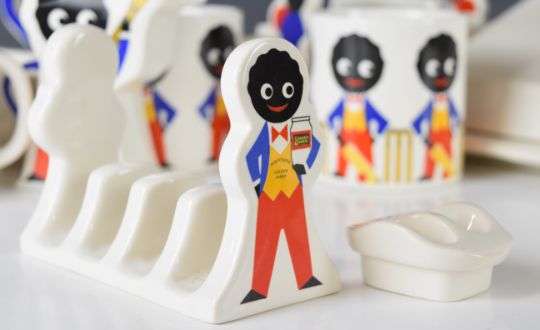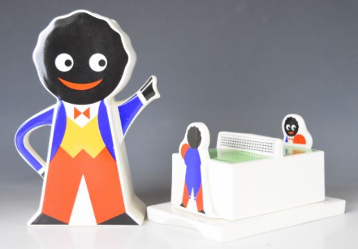 Sixteen pieces of The Silver Crane Company James Robertson & Sons golly jam advertising ceramics comprising table tennis butter dish, skiing cheese dish, coffee/ teapot, toast rack, salt and pepper, jug, four mugs, four eggcups and a grand piano jam or marmalade dish.