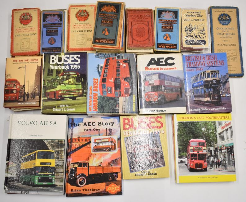 Approximately 30 bus and tram interest books to include Ian Allan, London Transport and ABC guides, together with a quantity of vintage maps and guides, many linen backed
