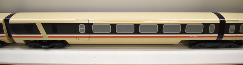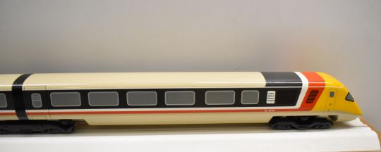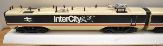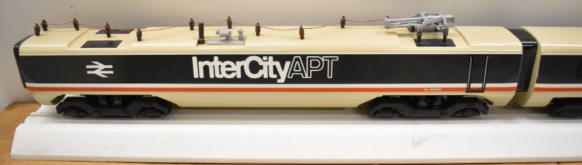 InterCity APT travel agent's display model of three carriages of the APT, on white track base, with label to end for Space Models Ltd of Feltham, length 128cm, in original box