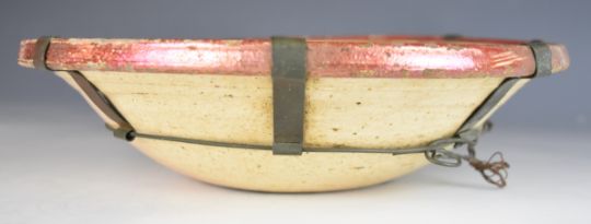 19thC French pottery jug with applied cockerel decoration and a Hispano Moresque bowl, tallest 16cm