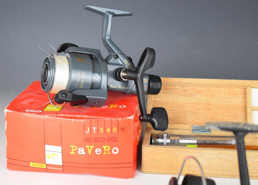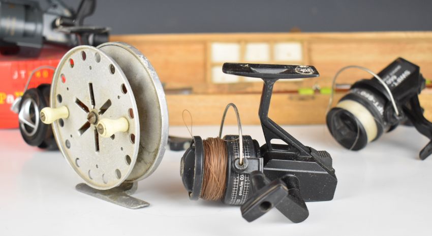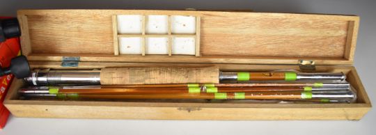Unusual early cane travelling five piece fly fishing rod in box 'Welcome Rod', fixed spool reels and a centrepin reel