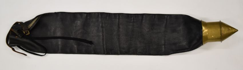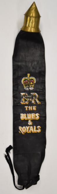British Army Blues and Royals leather guidon cover with retailer's label for Hobson & Son (London) Ltd, Elizabeth II Blues and Royals under crown painted to exterior, cloth lined with securing strap and tie, 126cm