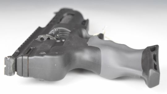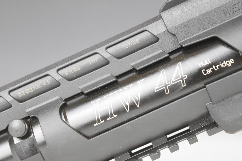 Weihrauch HW44 .177 PCP air pistol with shaped grips and adjustable sights. scope rail and 10-shot magazine, serial number 707036, with original tag.