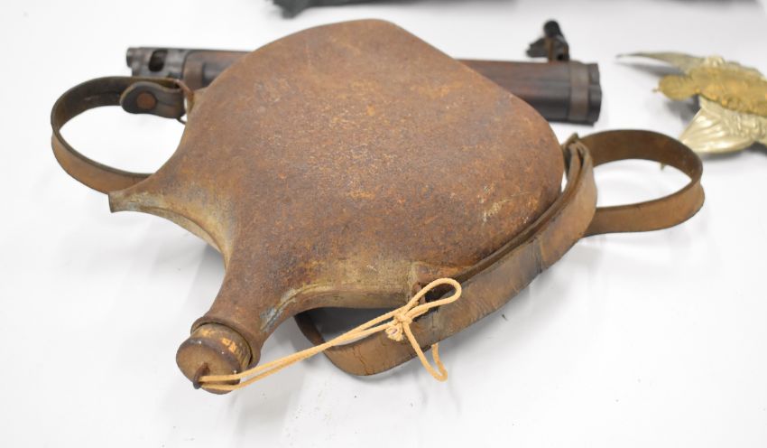 WW1 possibly French greatcoat, water bottle, cap badges, rifle end, postcards etc
