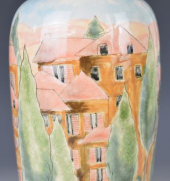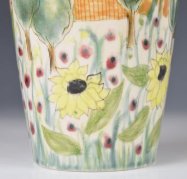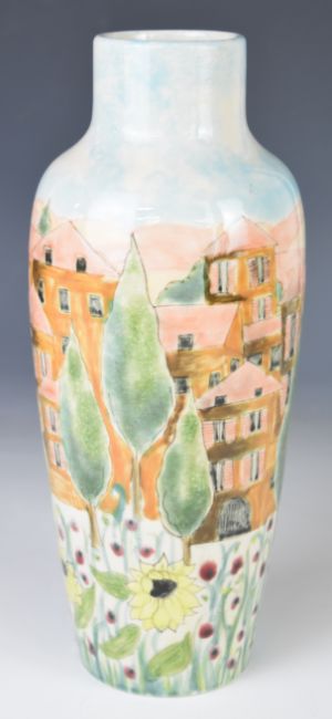 Cobridge limited edition 73/100 stoneware vase decorated with a continental village scene with sunflowers and poppies, in box, height 27cm, boxed