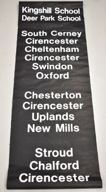 Bus destination blind for the Stroud Valleys to include Stroud, Stonehouse, Uley, Dursley, South Cerney, Cheltenham, Swindon and Oxford