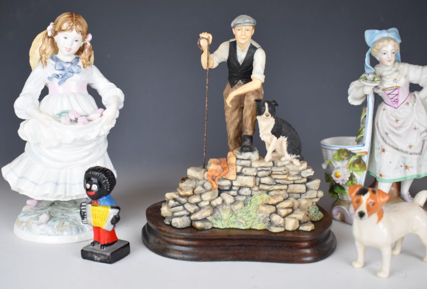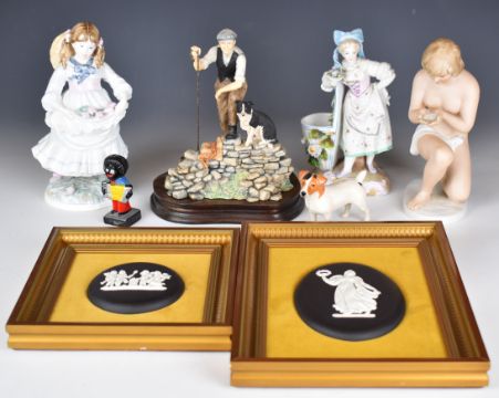 Porcelain and collectable figures including Art Deco German nude, Border Fine Arts Shepherd with Collie by Ayres, Beswick Jack Russell, Coalport and a pair of Wedgwood plaques, tallest 23cm