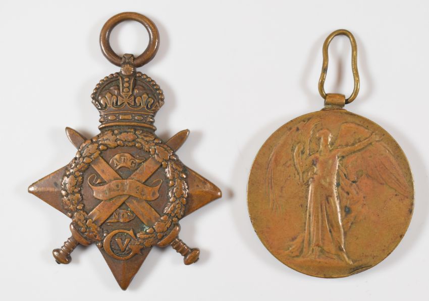 WW1 British Army medal pair 1914 Star and Victory Medal named to 2457 Pte W Timms, 1st Battalion Northumberland Fusiliers