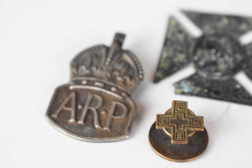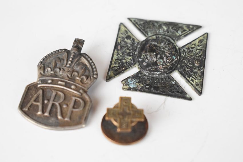 British Army WW1 medal pair comprising War Medal and Victory Medal named to 16748 Pte H T Merrett, Army Veterinary Corps, with ARP badge, New Zealand sweetheart brooch etc