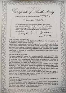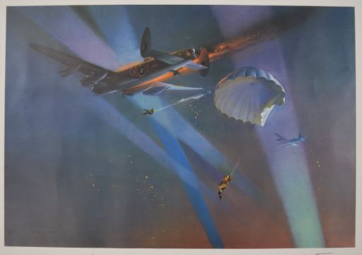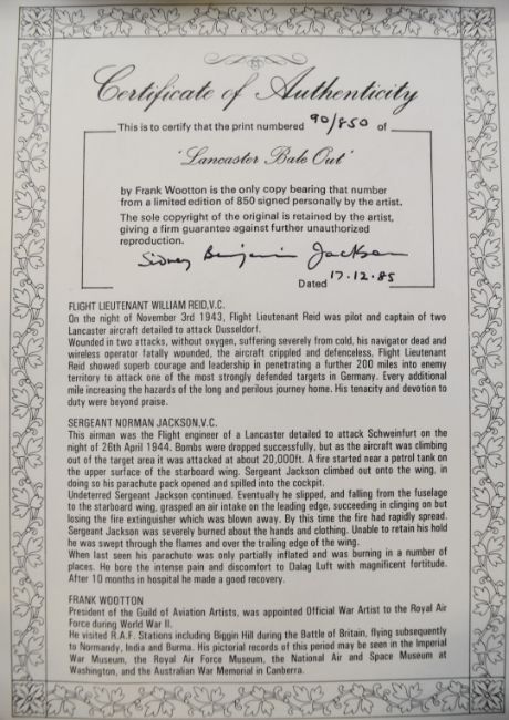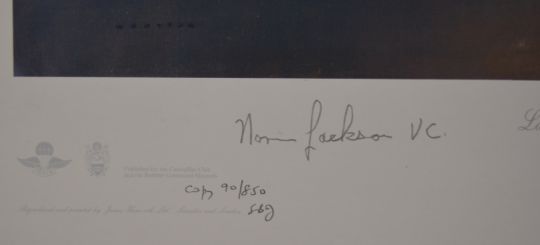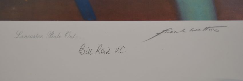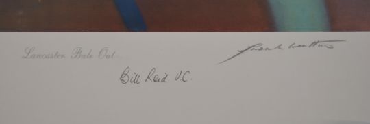 Royal Air Force WW2 interest Frank Wooton signed limited edition 90/850 print 'Lancaster Bail Out' published for the Caterpillar Club and the Bomber Command Museum, signed by Norman Jackson VC and Bill Reid VC
