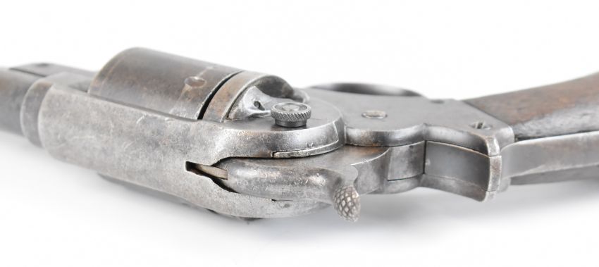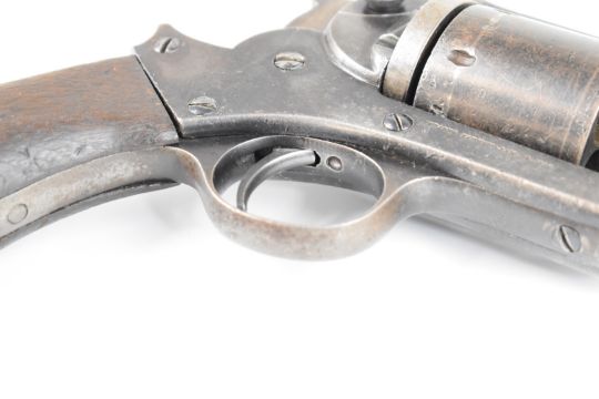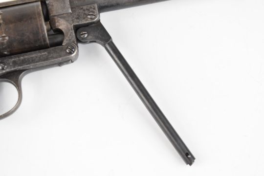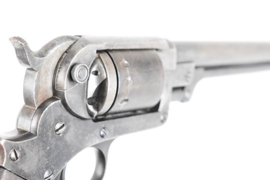 Starr Arms Co of New York .44 rim-fire six-shot single-action revolver with steel frame stamped to one side 'Starr Arms Co New York' and to the other 'Starr's patent Jan 15 1856', shaped wooden grips and 8 inch barrel, overall length 37.5cm.