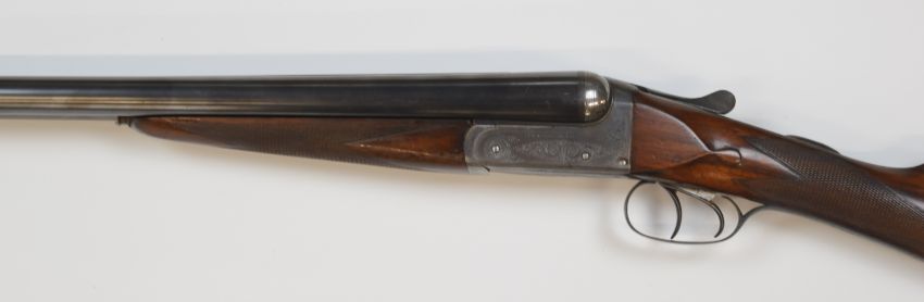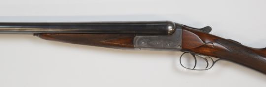 J & W Tolley Ltd 12 bore side by side ejector shotgun with named and engraved locks, engraved underside, trigger guard, top plate, thumb lever and fences, chequered grip and forend, carved teardrop to the wrist, vacant cartouche to the underside of the stock, double trigger and named 30 inch barrels ½ and unchoked, overall length 118cm, length of pull 37cm, serial number 9674. PLEASE NOTE THAT A VALID RELEVANT FIREARMS/SHOTGUN CERTIFICATE IS REQUIRED TO HANDLE/PURCHASE THIS ITEM.