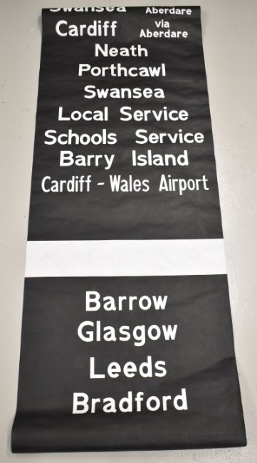 Bus destination blind including Swansea, Porthcawl, Leeds, Glasgow and Barry Island