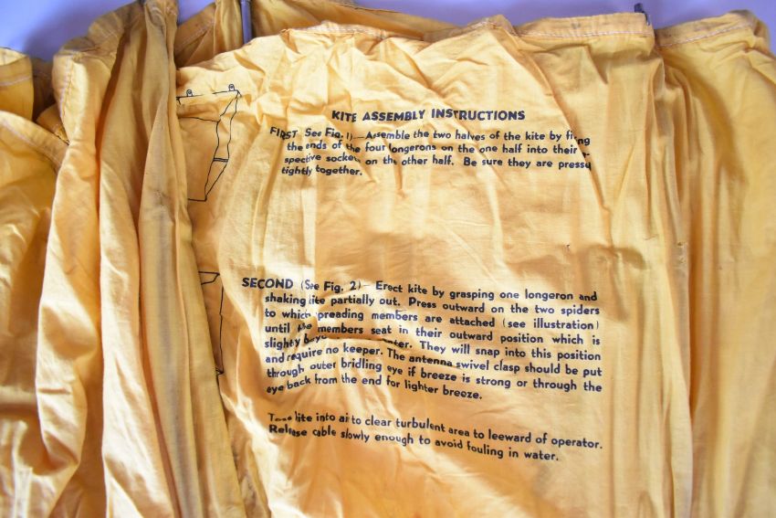 WW2 Royal Air Force Gibson Girl Aerial box kite M-357-A with metal container and instructions though somewhat obscured