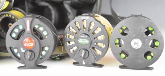 Vision canvas fly fishing reel sectioned bag with reels, spools and line including Fisker Compo 69, Sangan SE SE300, Okuma Airframe etc