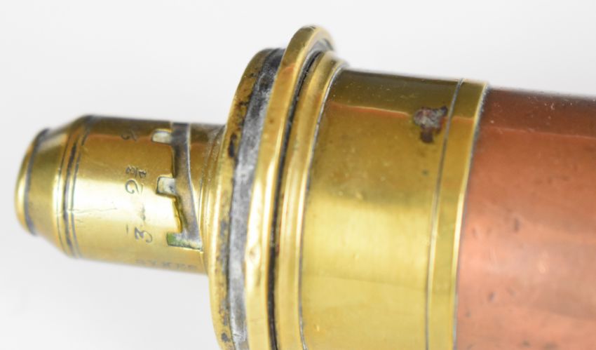 Sykes Extra Quality copper and brass powder flasks and an R Hughes 12 bore shotgun cartridge re-loading roll turnover tool.