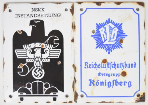 Two German Nazi enamel signs RLB Reichsluftschutzbund Ortsgrupp Konigsberg and NSKK Instandsetzung, each 17 x 12cm