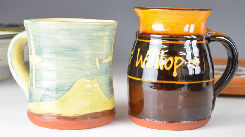 Collection of studio pottery including Alan Wallwork cheese dish with tile, Alvin Irving dish, Colin Kellan pedestal bowl, slipware tankard etc