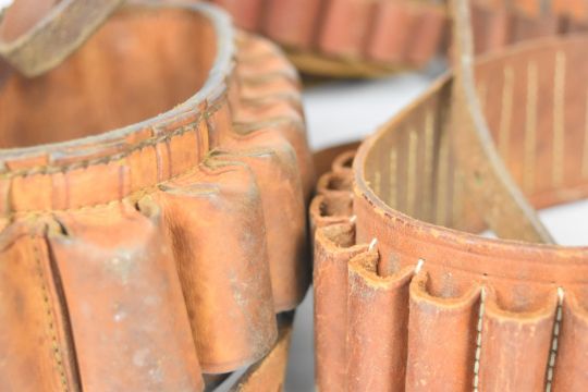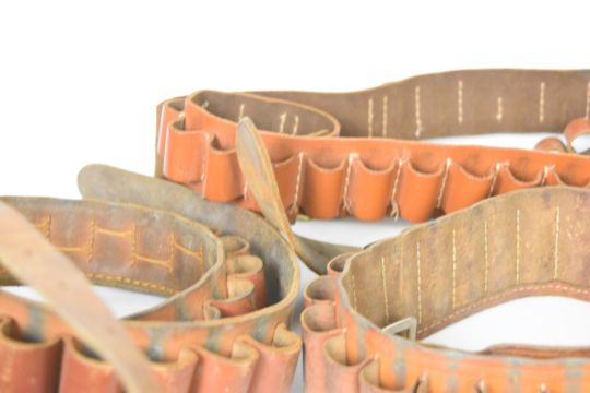 Seven leather shotgun cartridge belts including .410 and 12 bore.