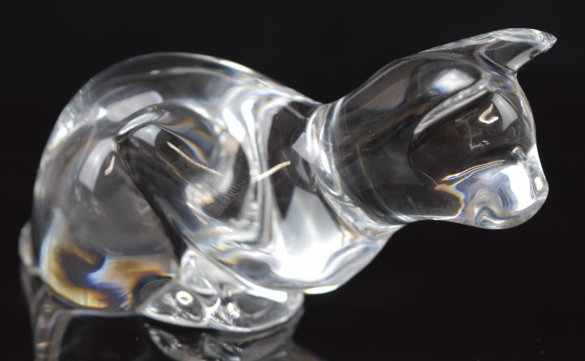 Baccarat clear glass paperweight in the form of a cat, signed to base, 12cm long.
