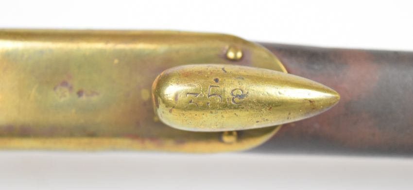Martini Henry 1876 pattern rifle bayonet with socket stamped '7BI 188' and 21.25 inch fullered triangular blade stamped 'WD' under broad arrow and 'B E 27 7/8', in brass and leather scabbard. PLEASE NOTE ALL BLADED ITEMS ARE SUBJECT TO OVER 18 CHECK ON COLLECTION OR DELIVERY