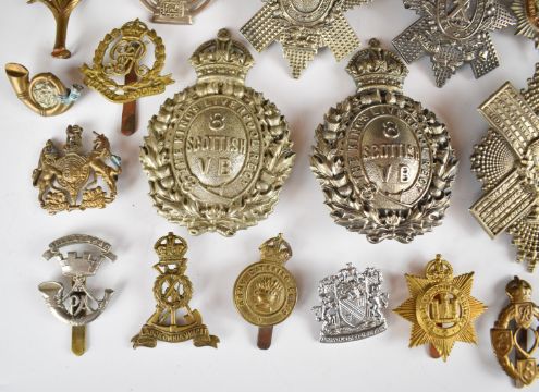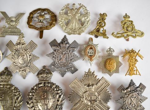 Twenty nine British Army metal badges including Highland Battalion Cyclists Territorial Force, 92nd Gordon Highlanders, 8th Scottish King's Liverpool Volunteer Battalion, South Lancashire, Royal Artillery and Somerset Light Infantry, some restrikes