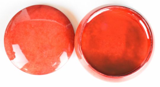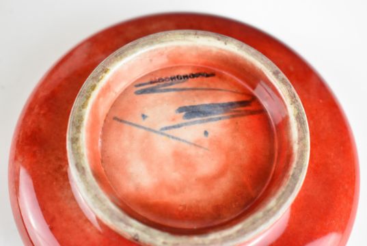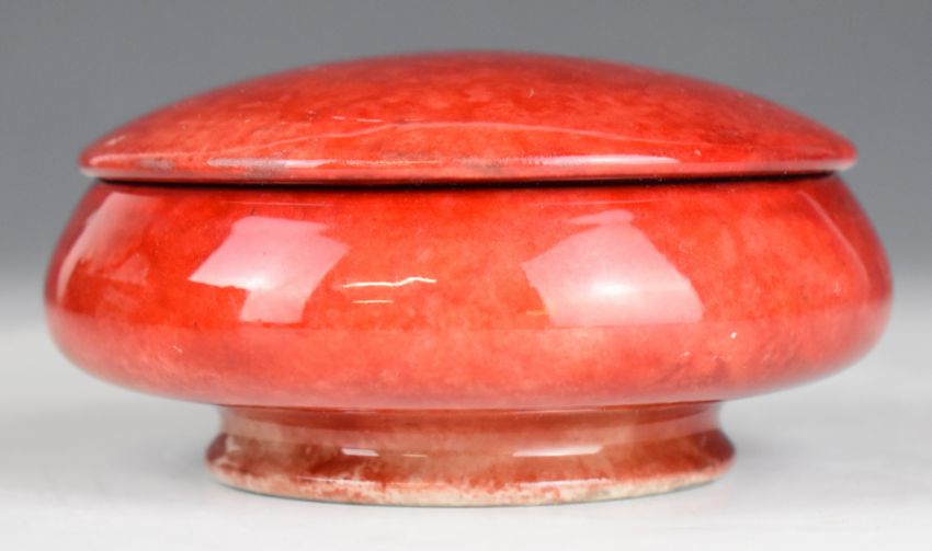 William Moorcroft flambé pedestal covered pot, with signature to the base, circa 1930s, diameter 22cm, height 6cm