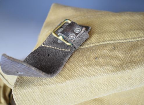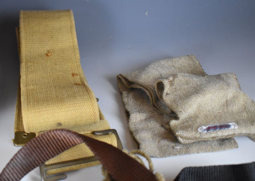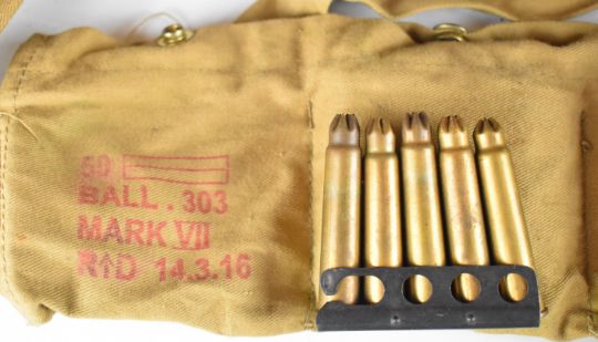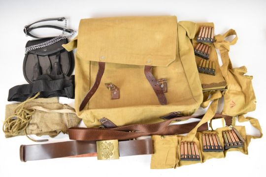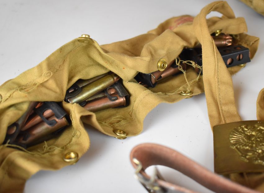 Two WW1 reproduction cloth bandoliers with blank ammunition, canvas bag, belts etc