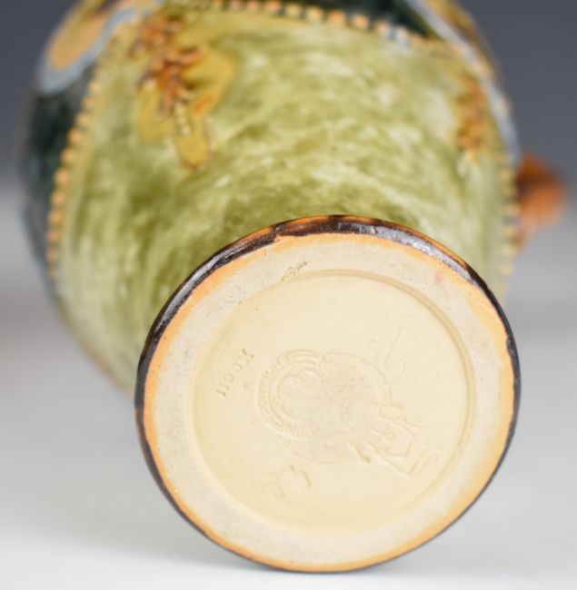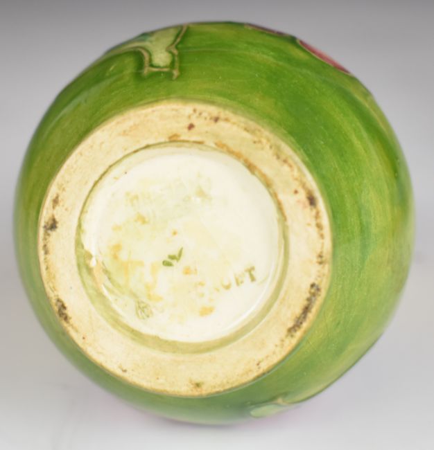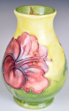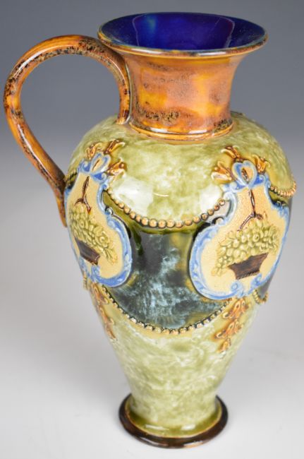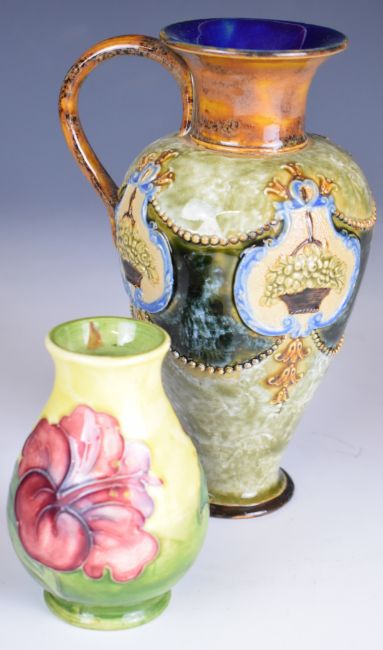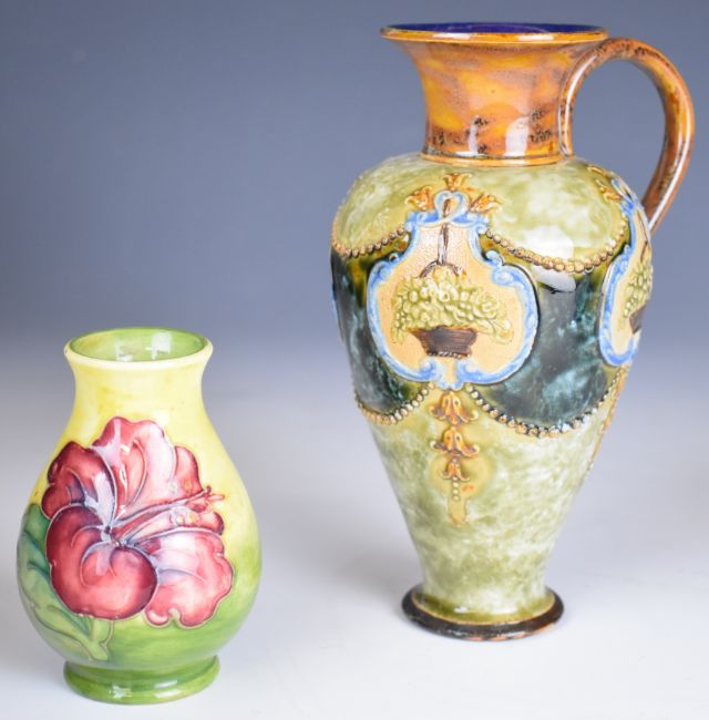 Royal Doulton ewer, a Moorcroft vase decorated in the Hibiscus pattern and a Wedgwood Jasperware teapot, tallest height 18.5cm