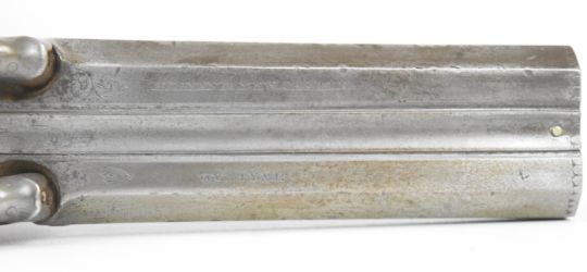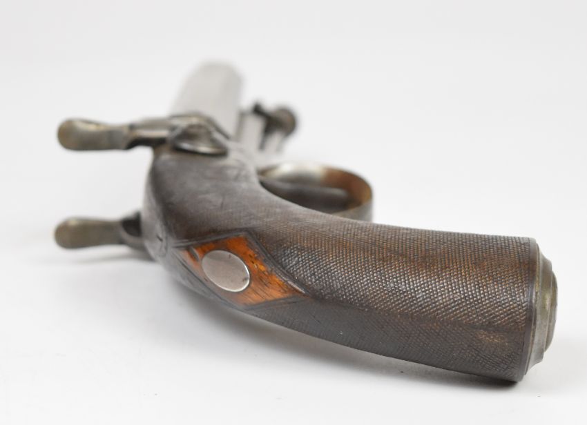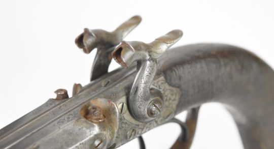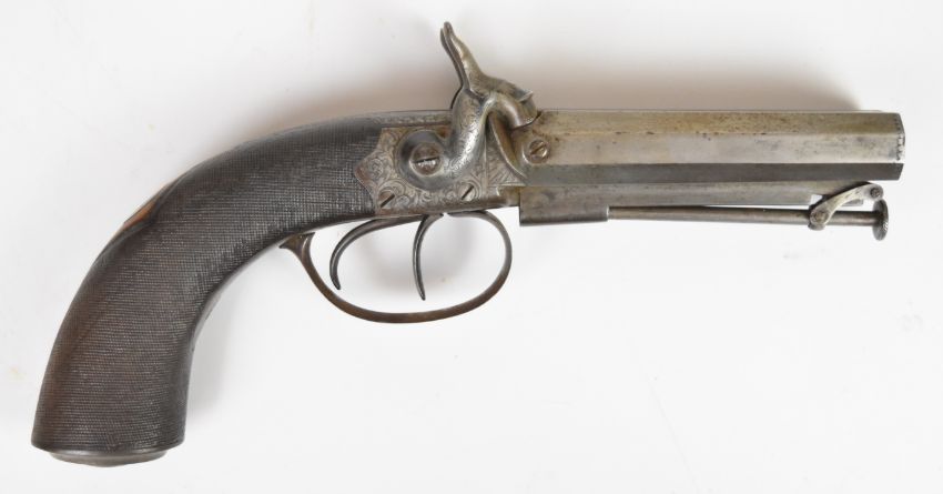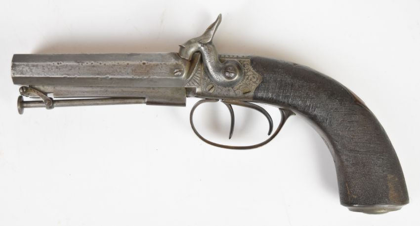 Burnand of Newcastle on Tyne double barrelled side by side percussion hammer action pocket pistol with finely engraved locks, stylised dolphin hammers, trigger guard, top plate and and mounts, storage compartment to the butt, vacant wrist cartouche, captive ram-rod and named 4 inch octagonal barrels, overall length 25cm.