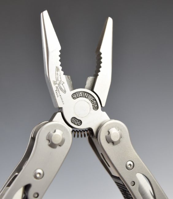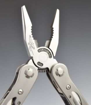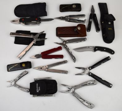 Ten multitools, some with blades including three Leatherman examples and a Marksman, eight with pouches. PLEASE NOTE ALL BLADED ITEMS ARE SUBJECT TO OVER 18 CHECK ON COLLECTION OR DELIVERY
