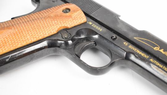 A pair of Franklin Mint John Wayne Armed Forces Commemorative replica Colt 1911 .45 Government Automatic pistols with signature to one side and chequered wooden grips, serial numbers JW 12958 and JW 22554.