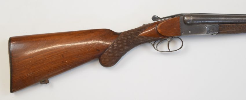Deactivated Belgian 20 bore side by side shotgun with chequered semi-pistol grip and forend, sling suspension mounts and 25 inch barrels, overall length 104cm, serial number 5545, with deactivation certificate dated 20/07/23.