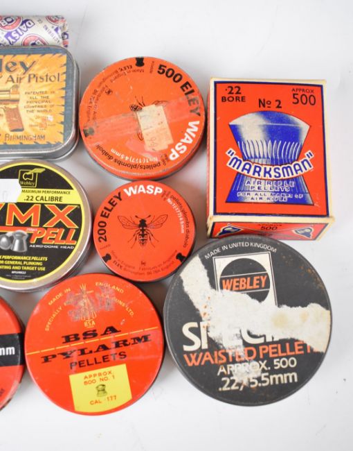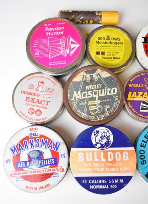 Nineteen tins and boxes of collectable air rifle pellets including Webley, Bulldog, Marksman, Daisy, Eley Wasp, BSA etc.