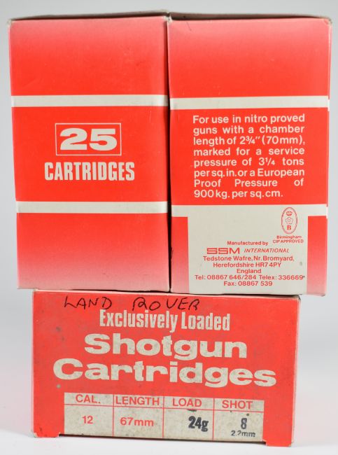 Seventy-five 12 bore Land Rover 24g 8 shot collector's shotgun cartridges, all in original boxes. PLEASE NOTE THAT A VALID RELEVANT FIREARMS/SHOTGUN CERTIFICATE IS REQUIRED TO HANDLE/PURCHASE THIS ITEM. We are not able to offer our usual postage service for this lot