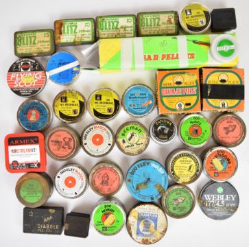 Forty-three tins and boxes of .177 and .22 air rifle pellets including vintage examples, Silver Jet Mount Star, Diabolo, Eley Match, RWS Hobby, Panther Match, Eley Wasp, Champion Heavyweight, Airgunaid Blitz, Viper etc, some sealed.