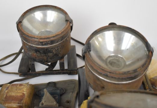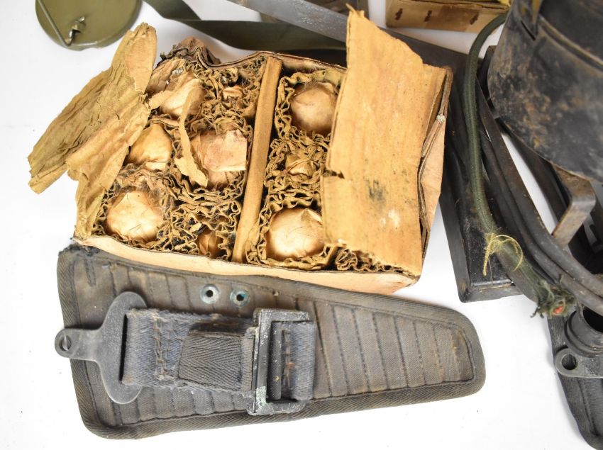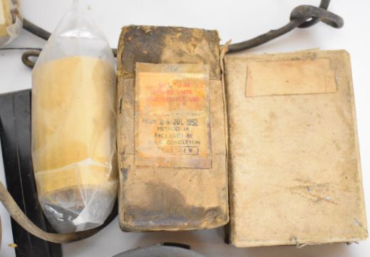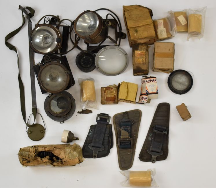 A collection of military equipment including lights, compass, bulbs etc, some in original packaging.