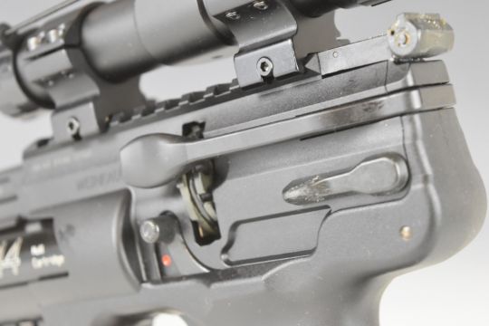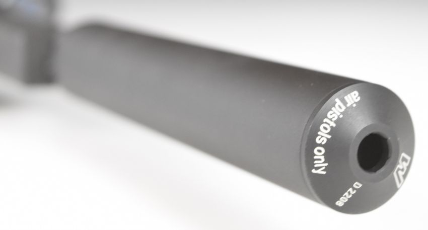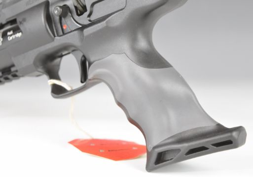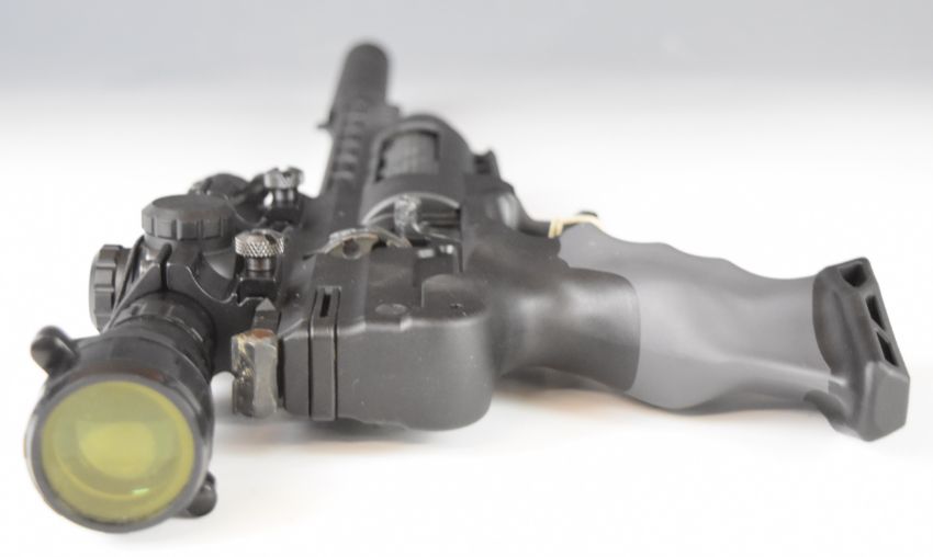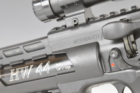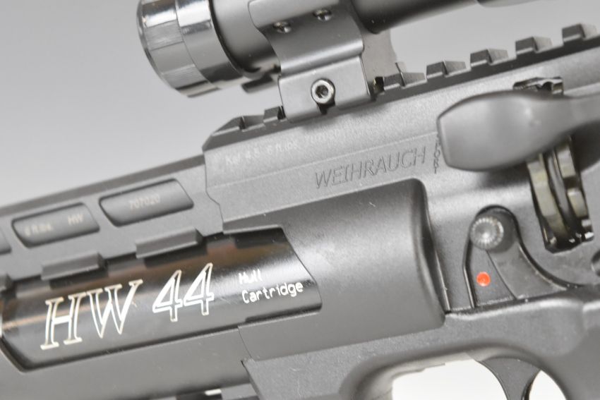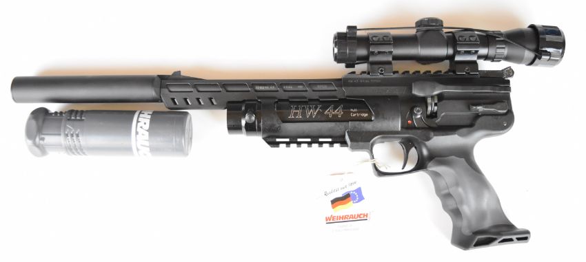 Weihrauch HW44 .177 PCP air pistol with shaped grips and adjustable sights. scope rail, sound moderator, 10-shot magazine and Weihrauch 2x20 scope, serial number 707020, with original tag and moderator tube.