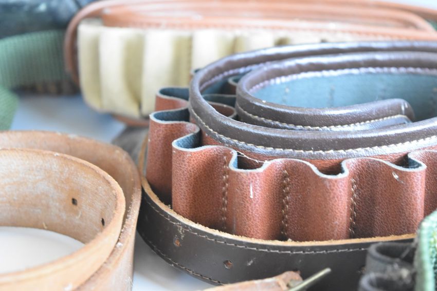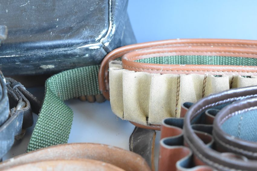 Nine shotgun and rifle cartridge bags and belts including vintage leather examples.