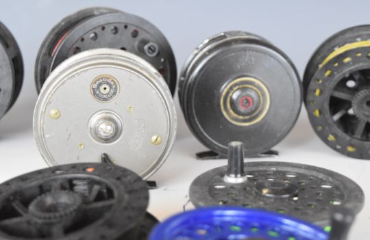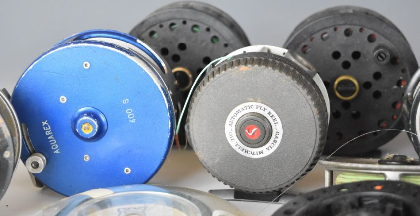 Vintage fly fishing reels including Orvis Magnalite multiplier, Still Water Trout, JW Young and Sons, Aquarex 400s Salmon reel, Lureflash Mamba with three spare spools, probably unused, Hardy fly line etc