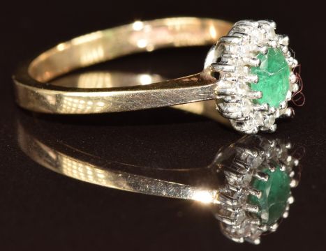 A 9ct gold ring set with an oval emerald surrounded by diamonds, 3.2g, size Q
