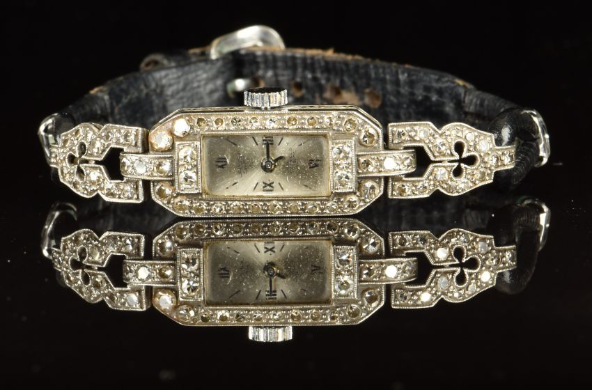 Oriosa Art Deco platinum ladies cocktail wristwatch with diamonds set to the case, blued hands, Roman numerals, silver dial, engraved case and unsigned movement, on leather strap, case size 25x11mm.