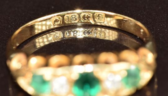 Edwardian 18ct gold ring set with emeralds and diamonds, Birmingham 1905, 2.3g, size H